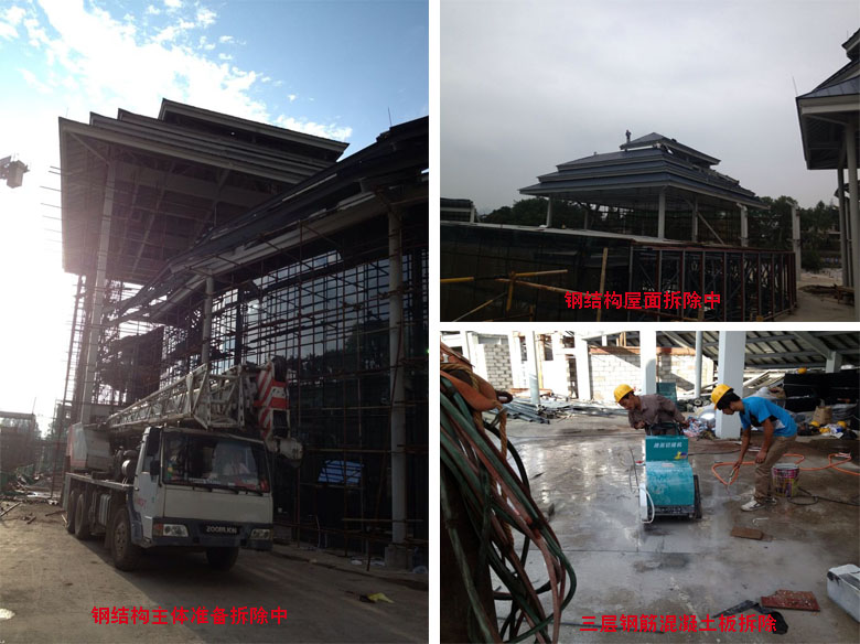 該工程拆除的原因,主要是建筑物的外形需要改變。主體結構為鋼結構,螺栓連接方式,我公司派出有多年加固拆除經驗的施工隊伍,用了20天時間拆除勝利完工。